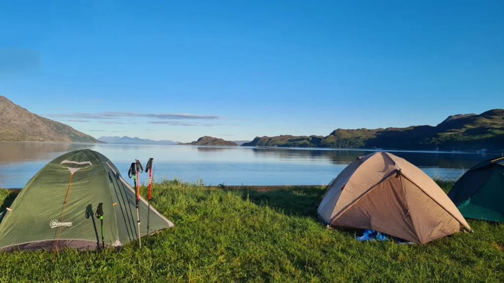 Camping on Knoydart is spectacular. Long Beach campsite is beautifully placed with a view out across Inverie Bay. The Isle of Rum is framed centrally on the horizon. The views are quite stunning. A great place to camp on Knoydart and use as your end destination, a starting point or your base for exploring the Rough Bounds.